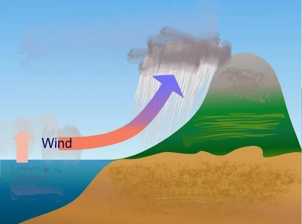 2.Orografik (Yamaç) Yağışlar:Dağ yamaçları boyunca yükselen nemli hava kütlelerinin soğuyup yoğuşmasıyla meydana gelen yağış şeklidir.Genelde kıyıya dönük yamaçlarda daha sık görülür.Güneydoğu Asya kıyılarında yazın görülen yağış şeklidir.